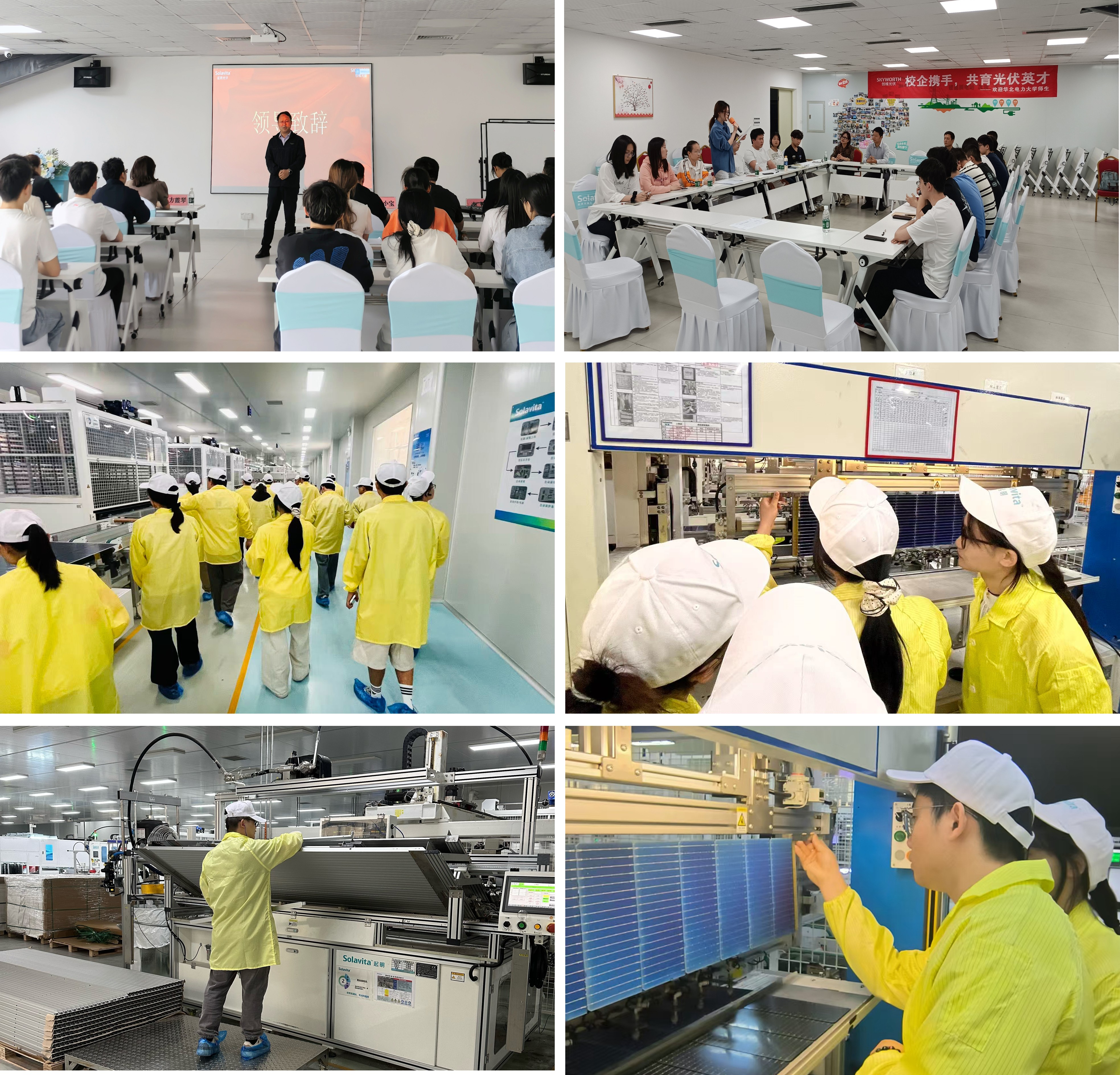 本次实习由校企双方组建联合指导团队,共同制定“现场培训+岗位实践+前沿研讨”的三维实习方案。企业方面由创维光伏公司党委副书记陈志远牵头,部品事业部制造总部总经理龙艳军、钙钛矿实验室主任杨铁斌、人力资源经理李赞、制造基地生产部经理李福临等专家组成指导团队,新能源学院选派方霞琴老师全程带队。